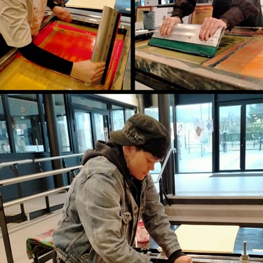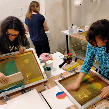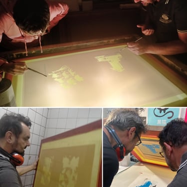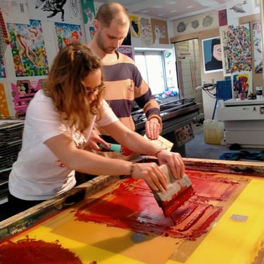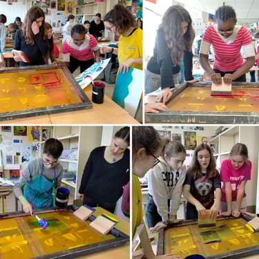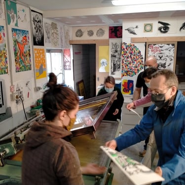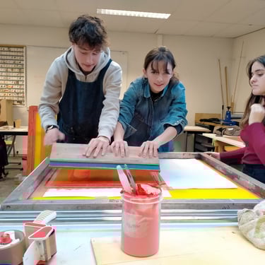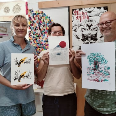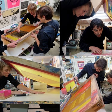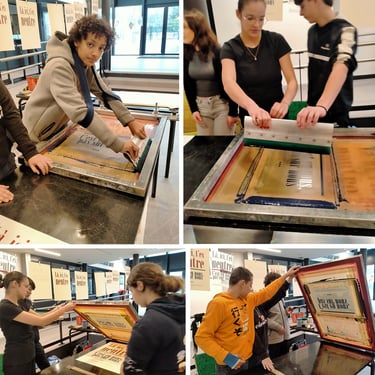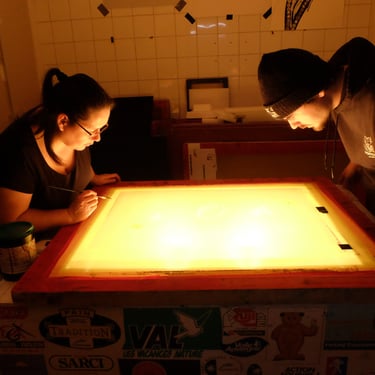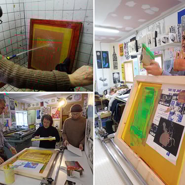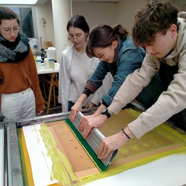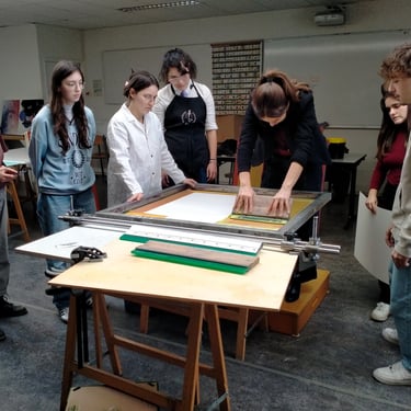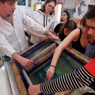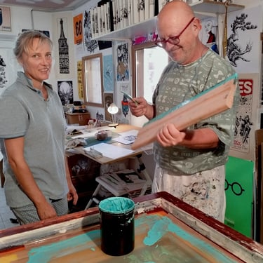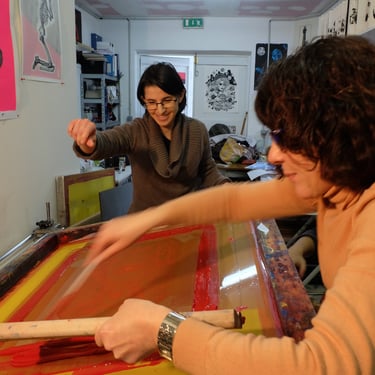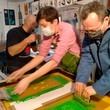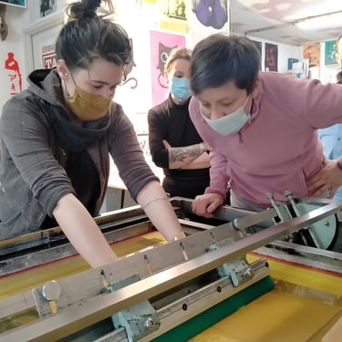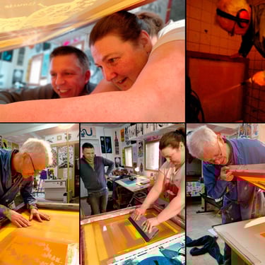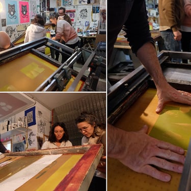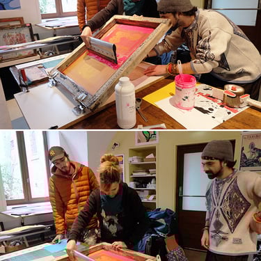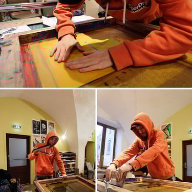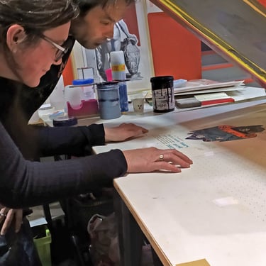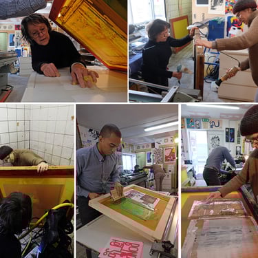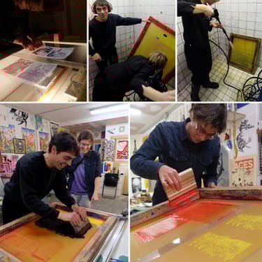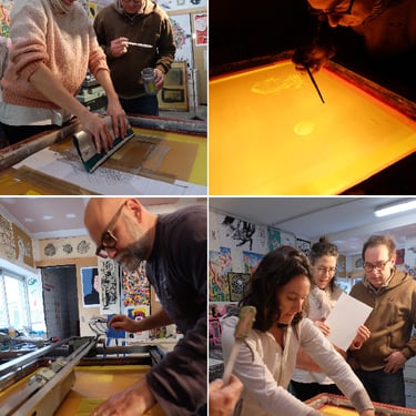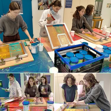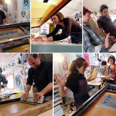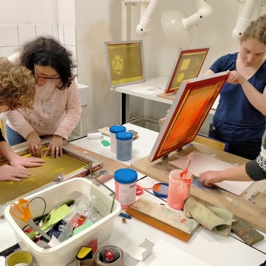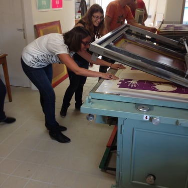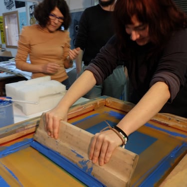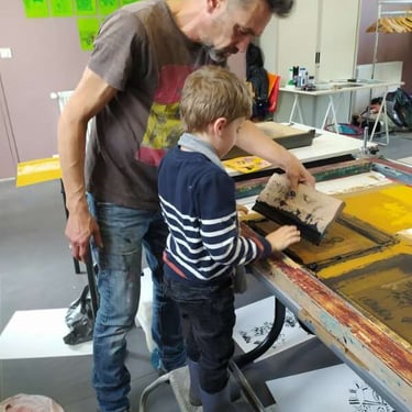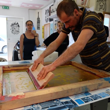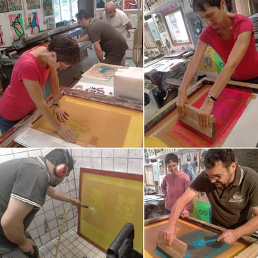 Je propose toute l'année des stages d'une journée (ou plus) destinés principalement aux artistes qui désirent imprimer leurs productions mais également à tous les curieux qui souhaitent découvrir cette technique. Les stages explorent toutes les étapes du procédé : Enduction des écrans, insolation, développement, calage, préparation des encres, tirage et dégravage des écrans.