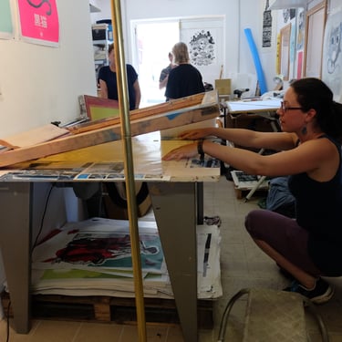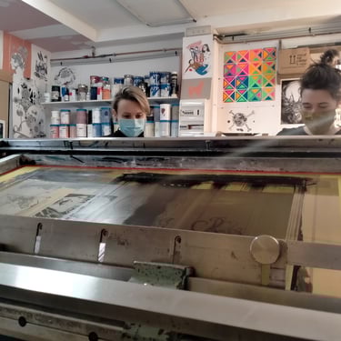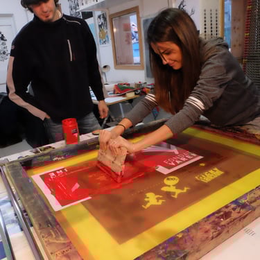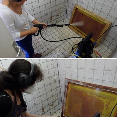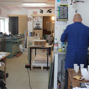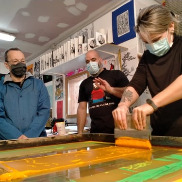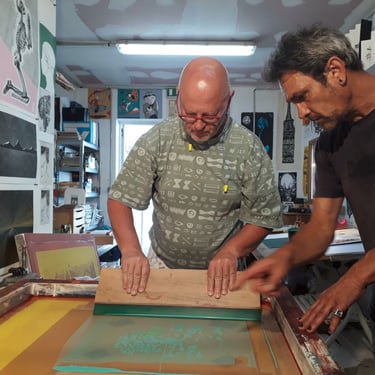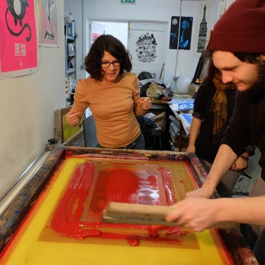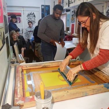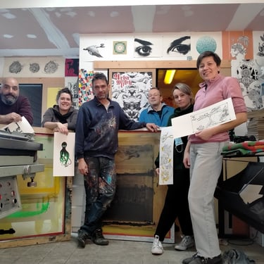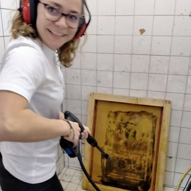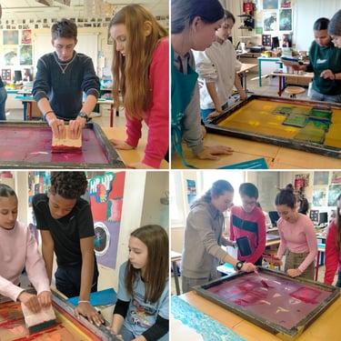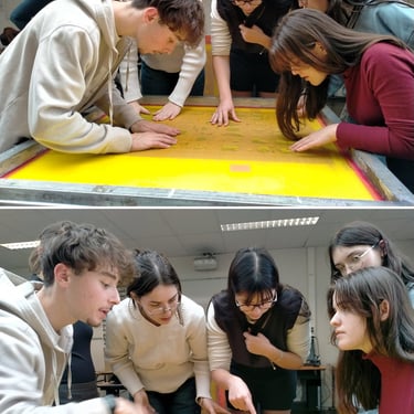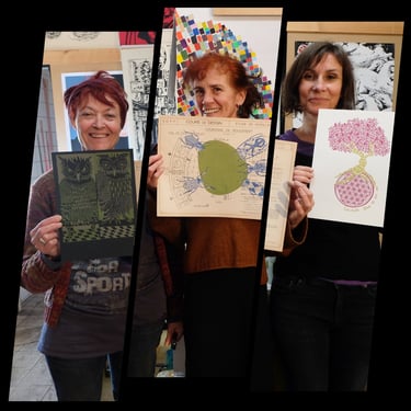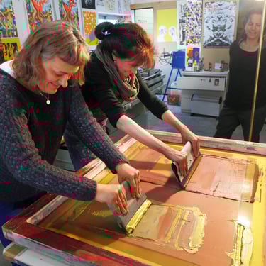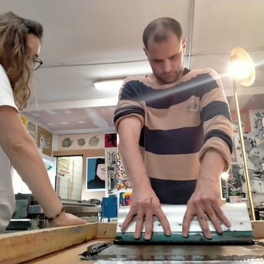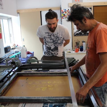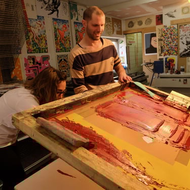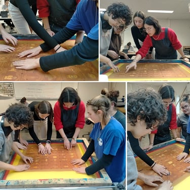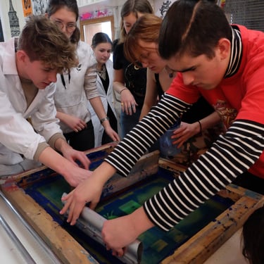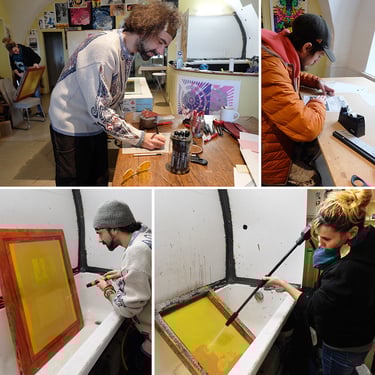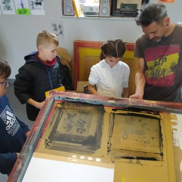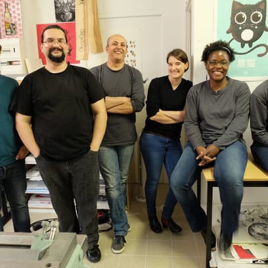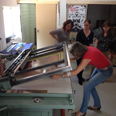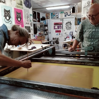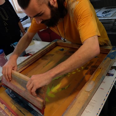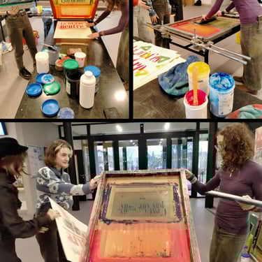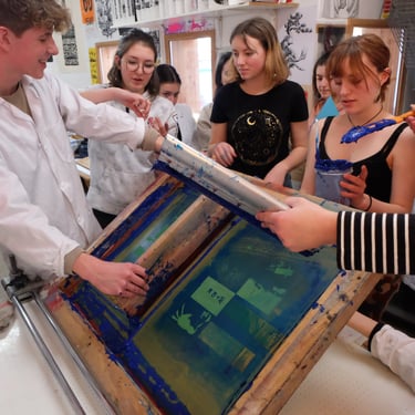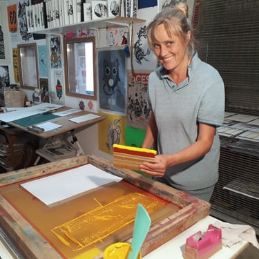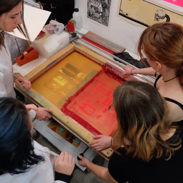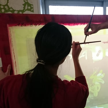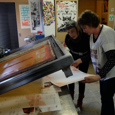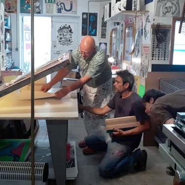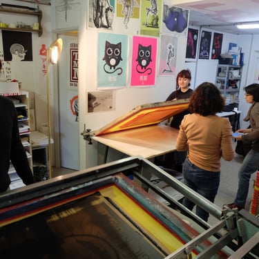 Je propose toute l'année des stages d'une journée (ou plus) destinés principalement aux artistes qui désirent imprimer leurs productions mais également à tous les curieux qui souhaitent découvrir cette technique. Les stages explorent toutes les étapes du procédé : Enduction des écrans, insolation, développement, calage, préparation des encres, tirage et dégravage des écrans.